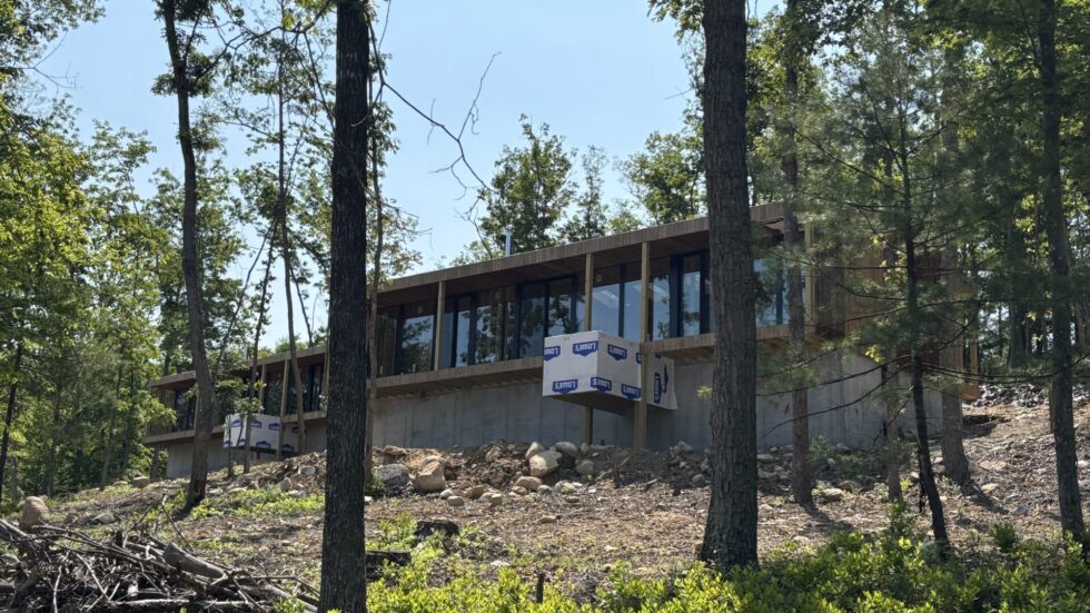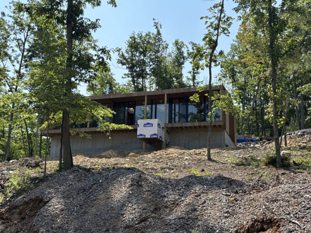 To achieve seamless visual connectivity with the forested horizon, the design incorporates Pella® Impervia® Direct Set Fiberglass Windows, including 10-foot sliding models that emphasize transparency, durability, and clean architectural lines.